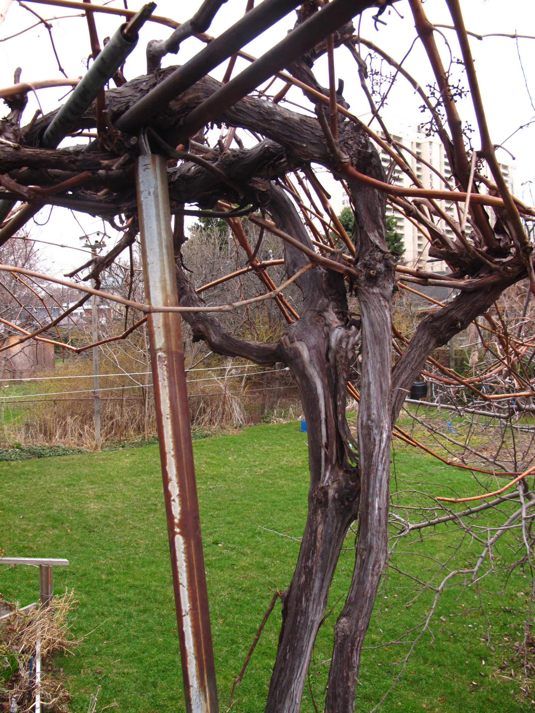 With each snip of the pruning shears, a branch of the grapevine falls from the pergola to the ground, followed moments later by droplets of sap. Like tears, they swell and expand until their weight makes them plummet from the cut stems, sometimes falling on my cheeks or forehead. I trim hurriedly and with resolve, as if I had a schedule to keep. Against the dull gray sky, the vine is a web of infinitely random shapes. Perched on top of the aluminum stepladder, I am barely able to poke my head through the snare of spidery branches, and can see only a thick, impenetrable canopy of braids, twists and knots. If they were sounds instead of twigs, they would constitute a cacophony, so tangled and messy they are, beyond redemption. It is a privileged view, reserved for the birds that fly overhead or alight on the arbour to rest.