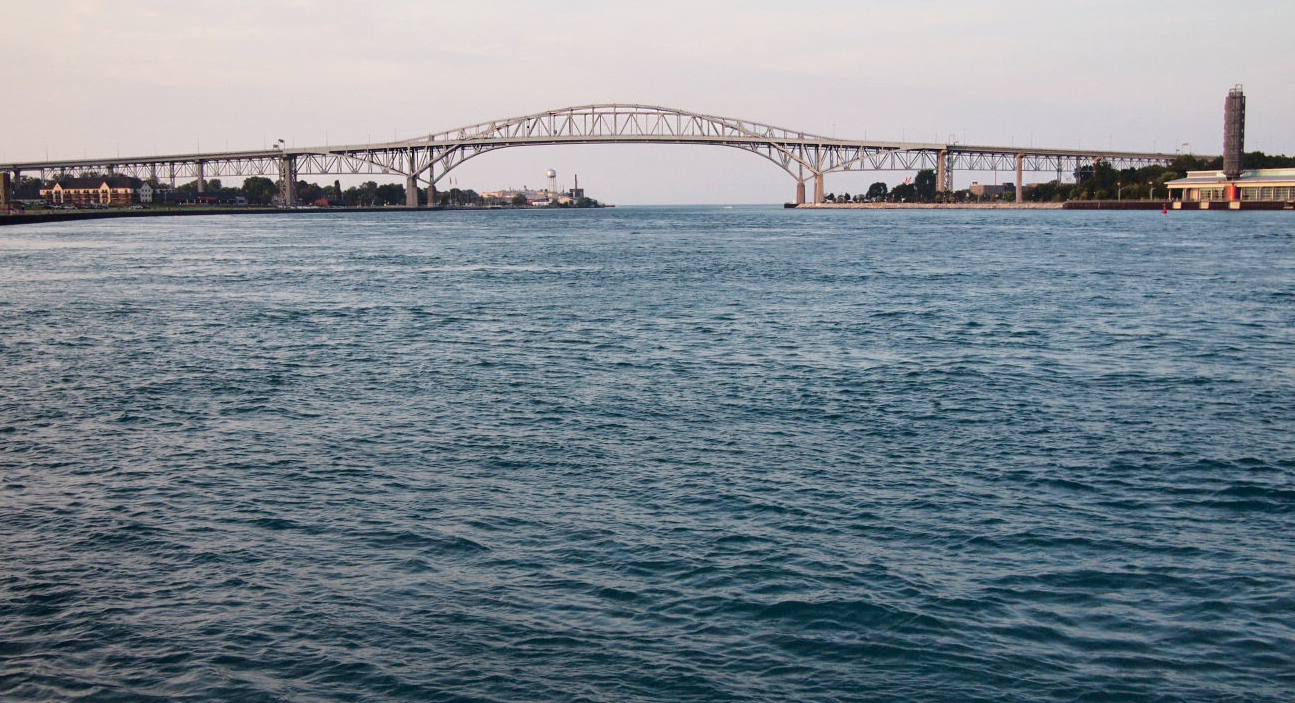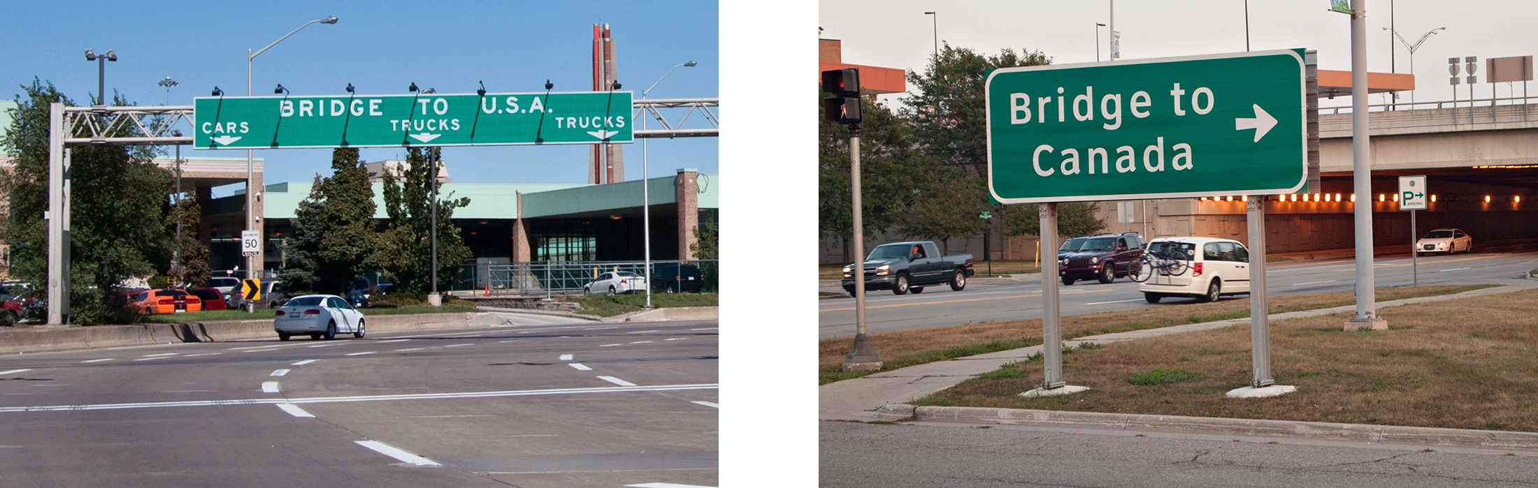 A few hours out from Toronto, driving through the sparsely populated countryside, I begin to anticipate the top of the bridge. The first glimpse always brings an ambivalent excitement; it marks the beginning of the transition. The bridges at Windsor and Sarnia are visible long before you get there, arching high over the shipping channel, which has also been deeply dredged, blamed by some for our current low water levels. Huge ocean-going vessels pass here, as I often saw from the shore when I was a kid.