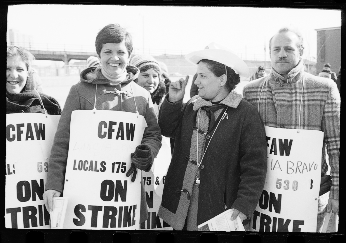 Portuguese men and women among the factory workers on strike with the Canadian Food & Allied Workers Local 530, outside Lancia-Bravo Foods factory in Toronto, February 18, 1979.