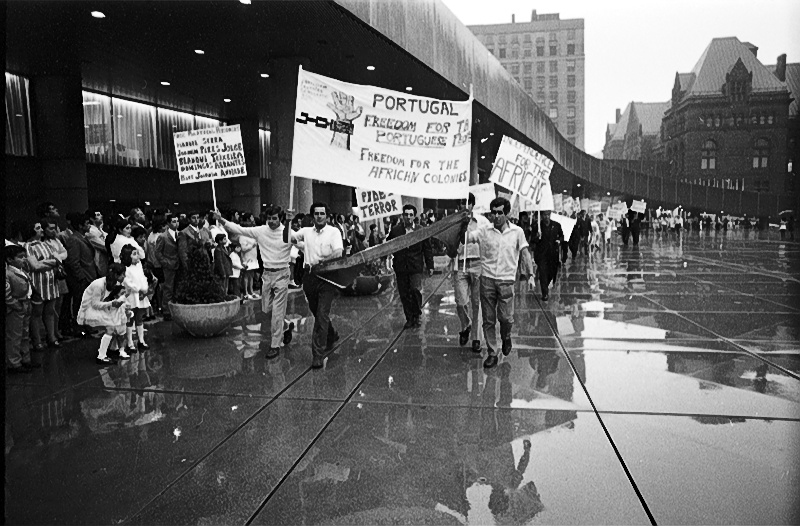 Anti-fascist and anti-colonial protest by PCDA members on Nathan Phillips Square, during Toronto’s Portugal Day celebration on June 14, 1971. Photo by Russell, York University Libraries, Clara Thomas Archives & Special Collections, Toronto Telegram fonds, F0433, ASC08245.