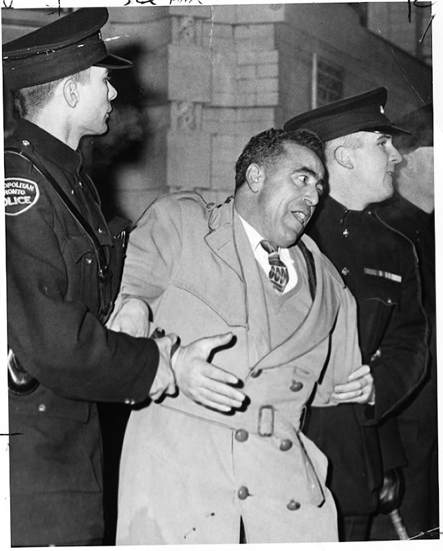 Pro-Salazar protester being arrested by Metropolitan Police Toronto outside the Portuguese Consulate on Bay St., January 29, 1961. Photo by Proulx, York University Libraries, Clara Thomas Archives & Special Collections, Toronto Telegram fonds, F0433, ASC27215.