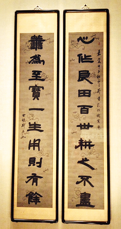 seal clerical cursive semi-cursive and standard. This may sound like rather dry information but the displays of the evolving symbols engaged us completely. Starting with basic strokes then moving to sweeping characters you could visualize the artist’s inky brush bending and touching fine paper or delicate fabric. Our guide described the way the brush was held and used – with the wrist perfectly still; the movement made with the whole arm, the shoulder – practically with one entire side of the body. We couldn’t help but think of a dance being performed. When we mentioned this notion to the guide she noted that Chinese calligraphers often created their art in front of audiences and in fact staged kinetic performances for all to admire their litheness.