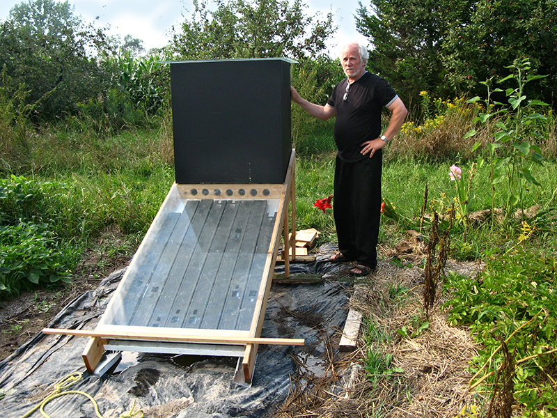 Years later, after Mary Lou had started her organic garden at our place in Prince Edward County and spent hours canning jars and jars of various tomatoes, I thought maybe we could dry them as well (or instead). Organic Sun Dried Tomatoes! Or better yet, Organic Solar Sun Dried Tomatoes! I looked up Solar Dehydrators on the Internet and of course there were lots of designs ranging from Factory Industrial Corporate designs to Home-made Old Hippy designs. I got the gist of how they worked and looked around our place to see what I could find that was somewhat ready-made so I wouldn’t have to spend too much time or money on making one. Lo and behold, I found some sheets of tempered glass I had bought cheap from a guy in Picton. Even better, they were exactly the same width as one of the sheet metal counters I had bought at the Temple Rummage Sale years before. All I had to do was build a stand for the box and make a primitive passive solar panel and attach it so that the heated air would flow up into the bottom of the box. Then I painted the box black to increase the thermal absorption and voila! With a bigger hole cut in the top and another sheet of glass bungeed to the top I had a veritable Solar Dehydrator! A miraculous transformation from a bank through a Zen Temple to an Organic Garden.