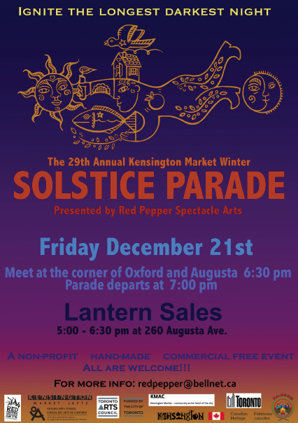 Solstice Parade poster Published December 6, 2018 at 426 × 604 in UPDATE: 2018 Kensington Market Winter Solstice Parade ← Previous Next → courtesy Red Pepper Festival Arts