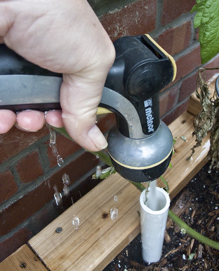 I want the pleasure of growing fresh organic vegetables without being tied down watering my garden all summer. Vegetables, especially tomatoes, require a great deal of water and the moisture content must be sustained in the soil – no drying out. But maintaining a regular watering schedule can put a crimp in travel plans. That’s what led me to building boxes that incorporate an irrigation system.