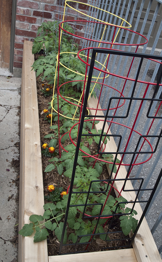 Tomato plants in cages Published April 23, 2015 at 679 × 1100 in BUILDING PLANTER BOXES: Making a Garden Out of a Garage ← Previous Next → © Schuster Gindin