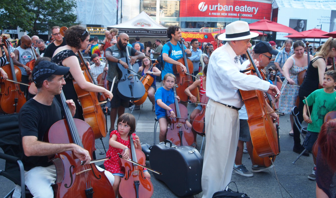 Up from the subway entrances, off streetcars and bikes, hundreds of musicians converged on Yonge Dundas Square with their instruments under their arms or strapped to their backs. They came there to play together outdoors in the square. Canadian composer John Oswald