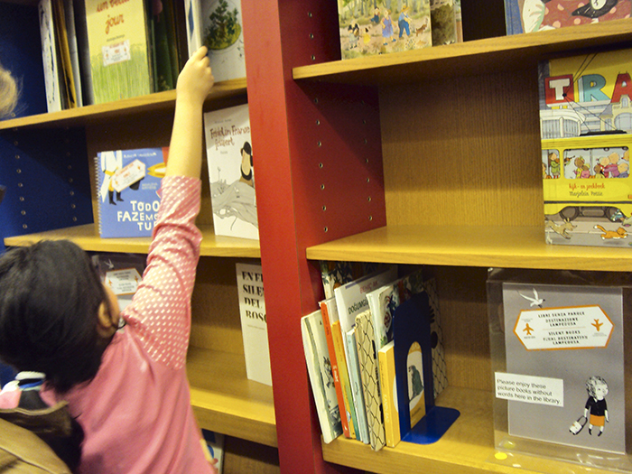 Ibby child taking book Published December 2, 2015 at 700 × 525 in Wordless Books for Kids Next → © Elizabeth Cinello