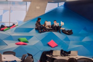 My favourite spot in the building, as in life, is the beach. The entire floor is open, expansive and bright with scattered, moveable furniture for spontaneous, flexible groupings. Warm, sand-coloured wood floors edged with aqua slope down toward a sea-blue carpet, where students lie on loungers as if floating, but without water worries for their open laptops.