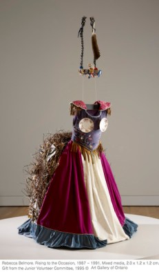 Rebecca Belmore is an award-winning Canadian artist and member of the Lac Seul First Nation (Anishnaabe) born in Upsala, Ontario, north of Thunder Bay. My introduction to her work was in a small gallery in the AGO devoted to art inspired by the encounter between Europeans and Native Americans, from the perspectives of both. The museum is now rearranging its collection and, sadly, that gallery has been dismantled; it was the most interesting room in the AGO. There were the usual oil paintings of Natives with high-cheekbones and feathered headdresses, but also interpretations of Europeans from the Aboriginal point of view, such as an Inuit sculpture of an English ship captain, the face carved on an ivory disk and inserted into the soapstone, its stark white a dramatic contrast to the dark stone. And in the centre of the room the most contemporary and ironic piece, Belmore’s Rising to the Occasion. It is clothing as performance, richly allusive and layered with history and meaning. She described its genesis in an interview with Wanda Nanabush: