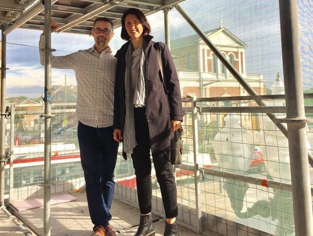 Heather and Kevin are also excited about their own office space on the third floor of the building. With the scaffolding still attached to the window openings, we step outside to get a view of what will be greeting them when they finally move in. “It’s an amazing view of the church [Saint Clare’s Roman Catholic Church] very inspiring, romantic, very European,” Heather beams, as the latest version of the St. Clair West streetcar glides by. The exceptionally high ceilings are a bonus.