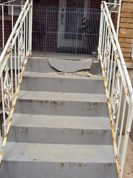 - Slanted, crooked, cracked, rotting and broken steps;