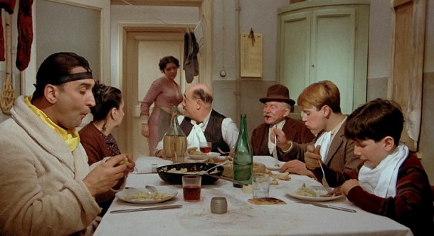 Side by side, Gelsomina eats a dish of pasta with no sauce, while Zompano lays into a plate of pasta with a healthy dollop of tomato sauce. More subtle and amusing is in one of the many comical and complex family dinner sequences in Amarcord. Lalo (the freeloading brother of Miranda, the matron) detects and savours, a ‘touch of sage’ in the soup as his brother-in-law (Aurelio) slowly fumes while his wife basks in the splendour of her brother’s ‘delicate palate’.