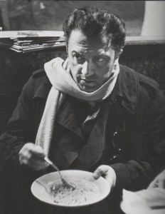 We think of “Eat Marcello, eat” from La Dolce Vita– the scene where Marcello Mastroianni’s fiancée, Emma, tries to force-feed him a banana. His rabid rejection of the banana, “I DON’T WANT A BANANA!” represents not only general annoyance with Emma, but a refusal of domesticity, stability and predictability, all of which precipitates his wild fall from grace for the remainder of the film. In La Strada we watch Anthony Quinn eat, nay ‘inhale’, an ice cream cone. A telling moment of the character’s brute simplicity and how he can lay waste to sweet simple things for his own benefit. The same film also yields the subtle and resonant contrast of Gelsomina (played by Giulietta Masina, Fellini’s wife) and Zompano (Quinn) visiting a country home on their itinerant clown tour of the country.