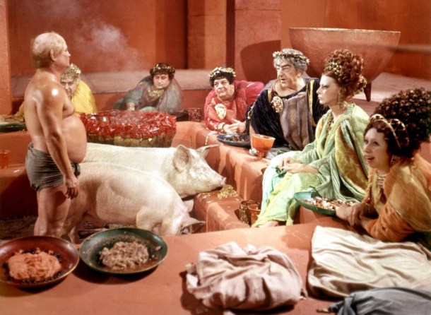 On the other extreme, who can forget the image from Fellini’s Satyricon of the cook at Trimalchio’s Feast sweating and rotating the pig on a spit. The stream of rendered fat echoes the profuse sweat of the cook. This is cuisine at its basest and Fellini was there.![]()