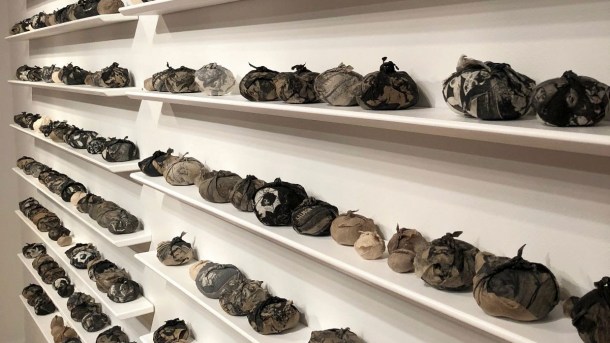 “Toronto printmaker Emma Nishimura, whose grandparents were interned, addresses that pain directly yet elliptically in an installation of little fabric bundles. In Japan, stores often give customers their purchases packaged in tasteful handkerchiefs, but here, the fabric is printed with fading memories, showing old photographs or merely blank grey.