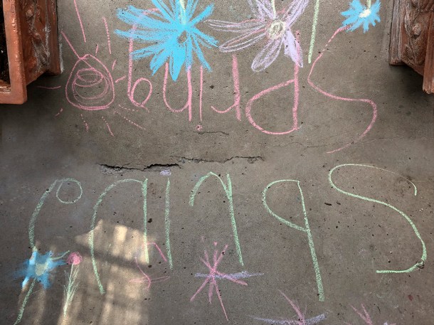 With that, two little girls have transformed a walkway into a bike and scooter race course. As always, the instant the ice and snow recede, wheels and chalk come out and sidewalks in every neighbourhood bloom with the first pastel colours of spring.