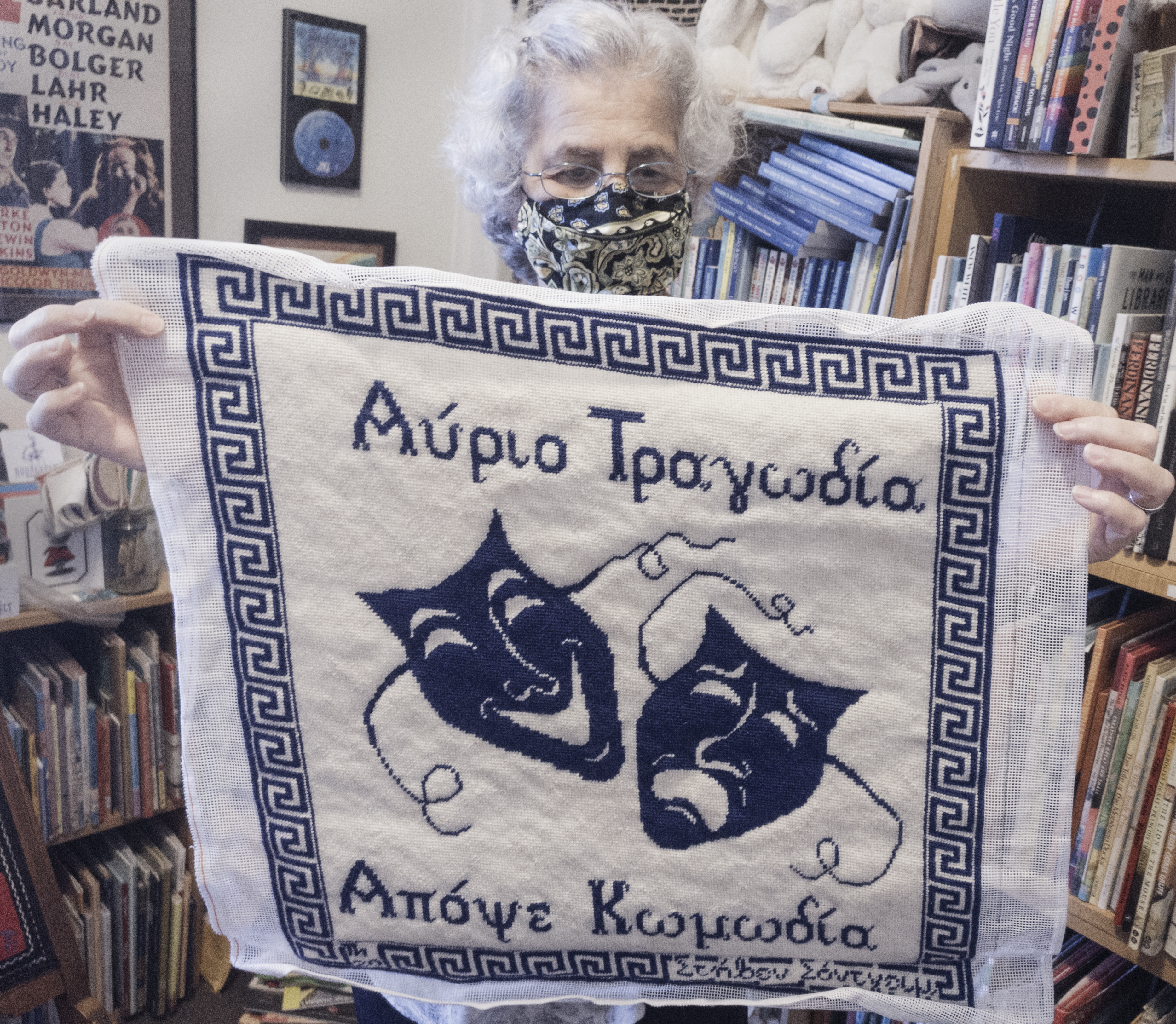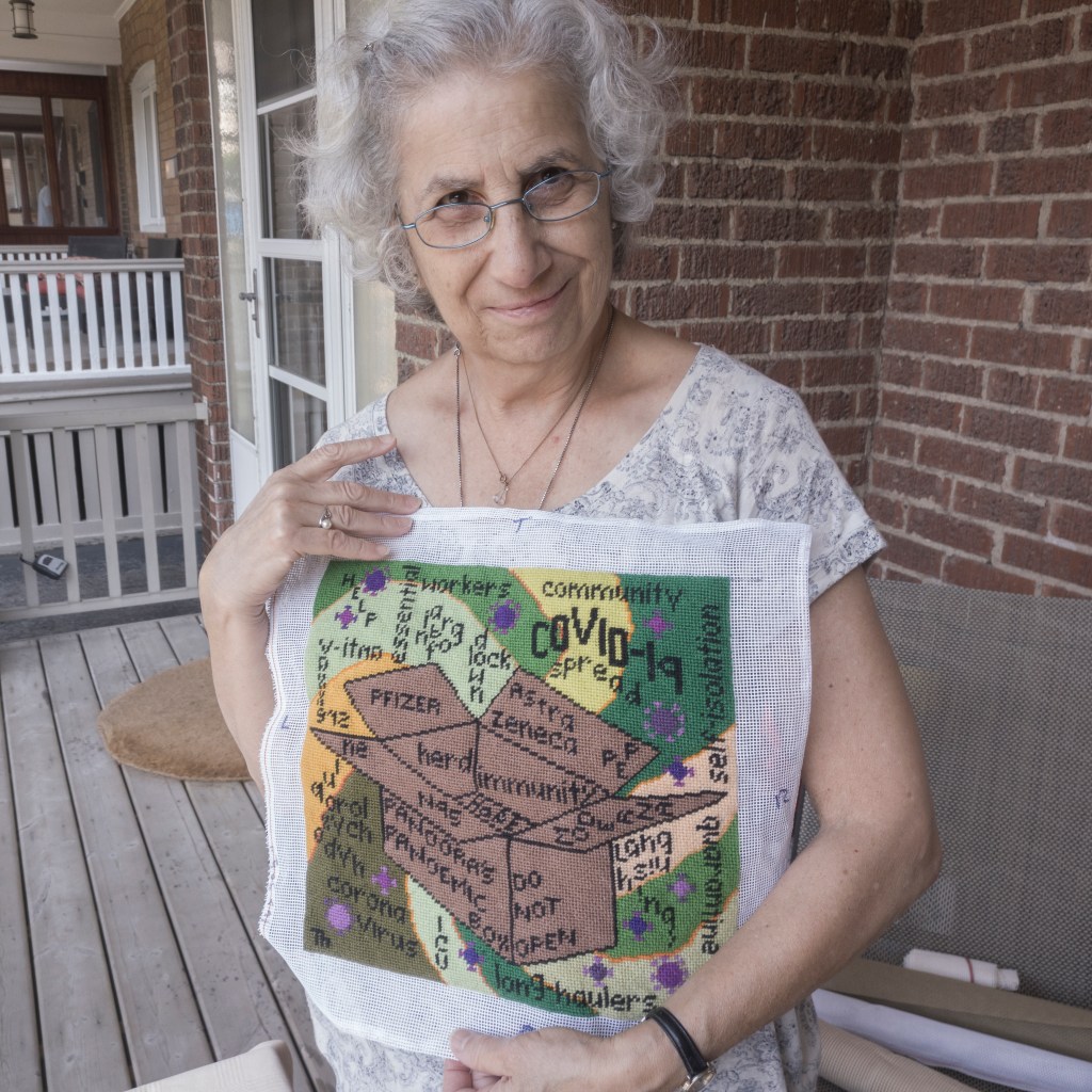 Children’s author, performer, and former librarian, Theo Heras, recently unveiled her newest needlepoint project, Pandora’s Pandemic Box. It is part of her series of needlepoint works called Words in Wool. At LT we love our librarians so we met up with Heras to discuss her version of that ill-omened box.