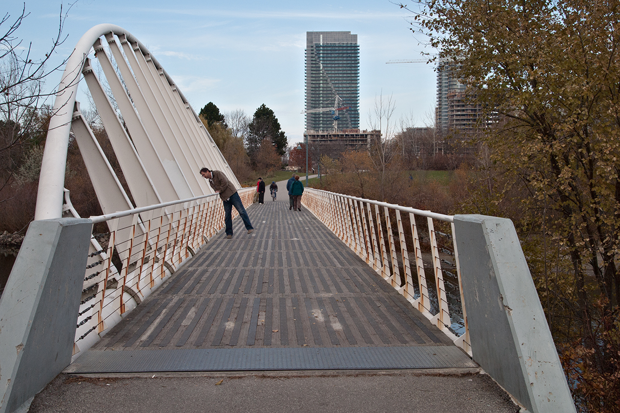 West of the Humber flows Mimico Creek. This small bridge seems to echo, with its white arch, the nearby Humber River bridge. Yet its unique engineering is intriguing to attentive walkers.
