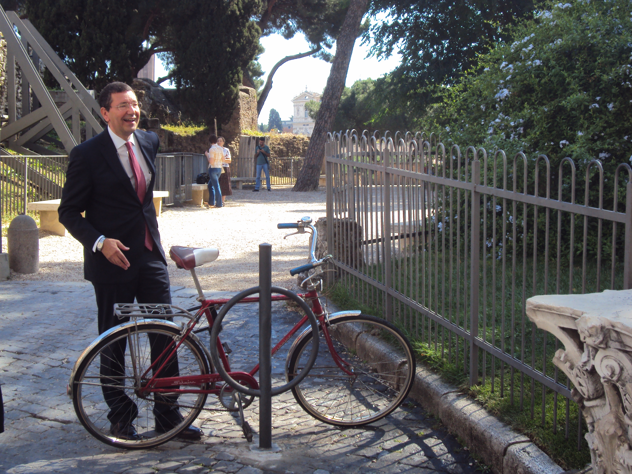 The second week in June, the newly-elected Mayor Ignazio Marino, a progressive who ousted Berlusconi’s man, Gianni Alemanno, hopped on a gearless red bicycle and rode around town in a suit and tie before heading to Rome’s city hall for his inauguration. City workers at the Campidoglio, the ancient seat of Rome’s government, installed a bicycle stand for his use.