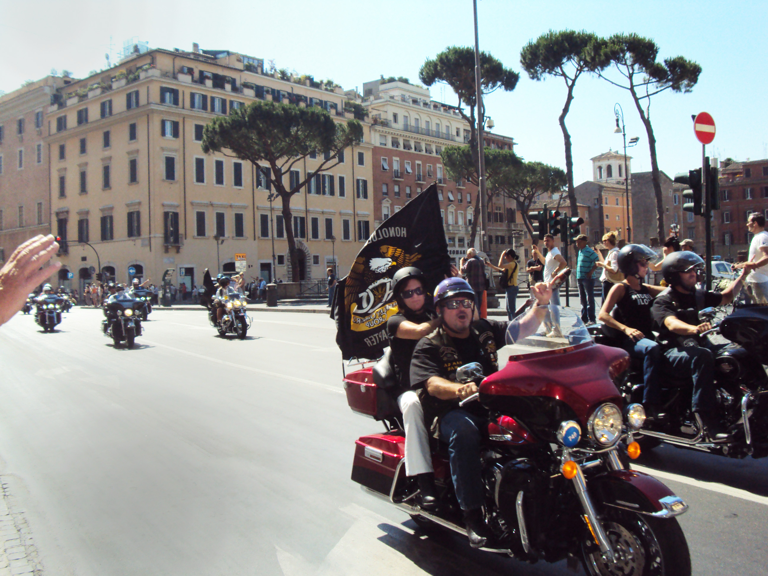 Motorcycles and Rome go together like tomato sauce and pasta but this past June, the downtown Roman neighbourhood in the historical centre, where I was staying, was besieged by motorcycles. HOG (Harley-Davidson Owners Group) members invaded Rome on the company’s 110th anniversary. They were based in nearby Ostia for a multi-day celebration. Over 100,000 HOG members arrived from all corners of the earth. Traffic police managed the chaos as bikers roared through the streets and parked all over town.