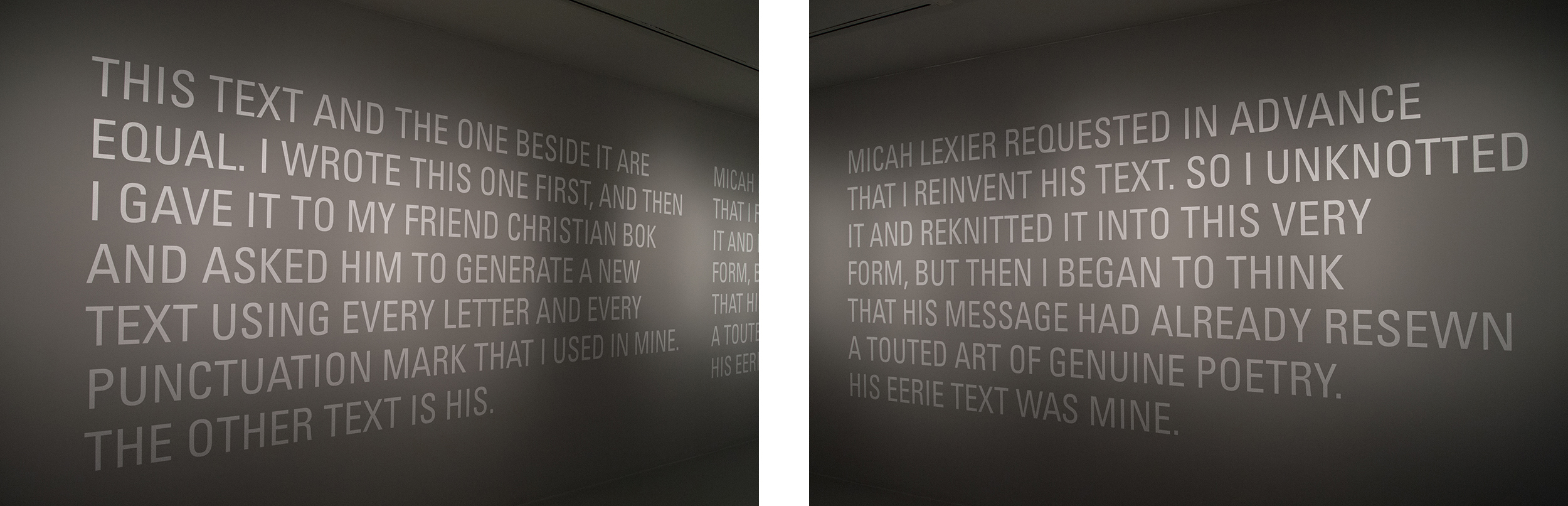 A collaboration between Lexier and Christian Bok, Two Equal Texts, brings to mind Robert Bringhurst, the BC poet, who brilliantly characterizes writing as the solid form of language. The limits of our written signifiers – the alphabet, grammar and punctuation – are the basis for an infinite variety of literature. This is emphasized in two ways; by imposing a further limit, explained in the text itself, and by enlarging the paragraphs themselves into a wall-sized installation.