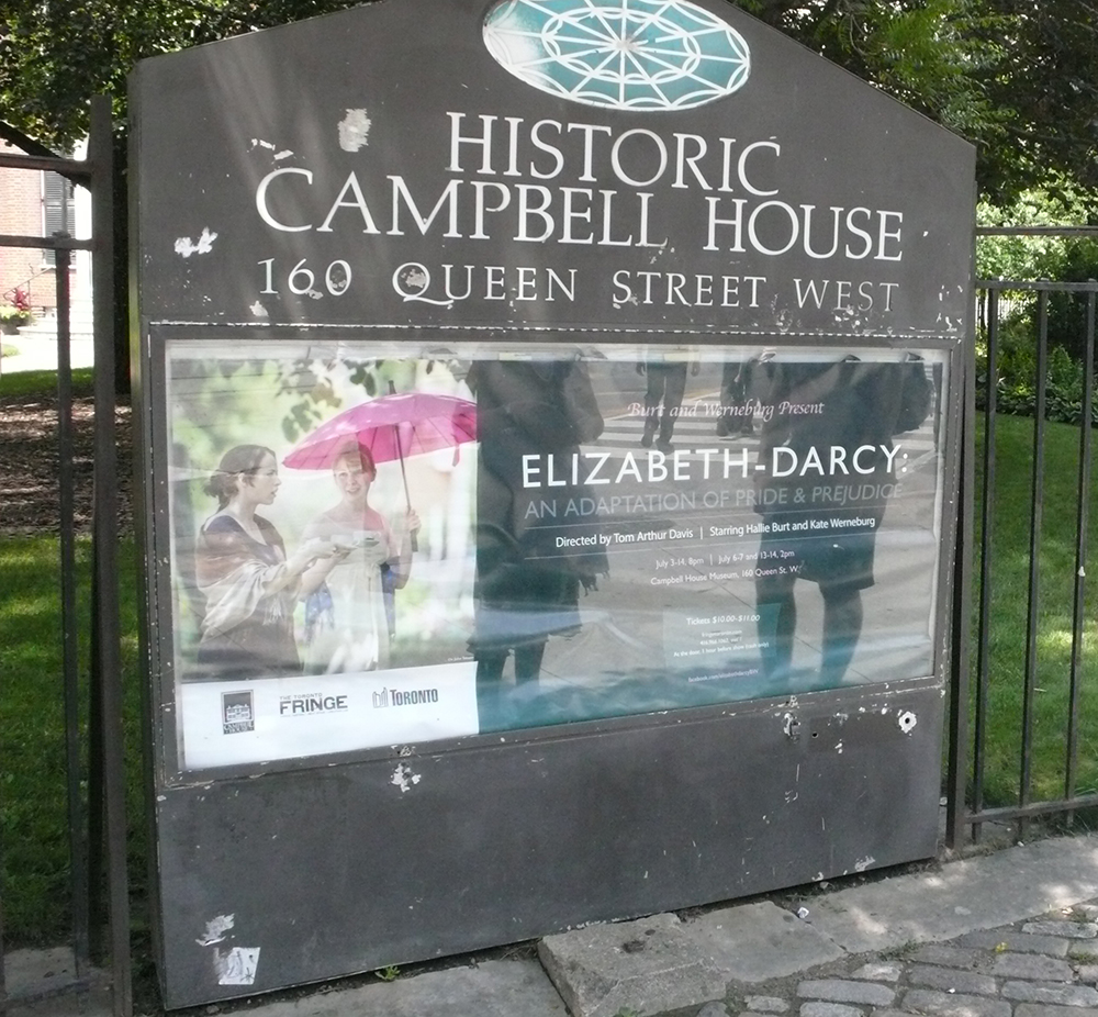 r shows, or be enticed by a piece that calls out to you personally because of the title or content. Perhaps you have always wanted to go to one of the venues such as Campbell House or Apple Self Storage or the Victory Café so you choose a play at that site. This was the reason for one of my choices, Elizabeth-Darcy: An Adaptation of Pride and Prejudice at Campbell House Museum. Two women perform Pride and Prejudice, each of them playing many roles to tell the story. The audience follows them from room to room through the house as the play unfolds over 75 minutes. The actors change roles seamlessly with minimal props and costumes. It is a very intimate theatre experience, so much so that I wanted to sit at the table with Elizabeth or dance with Mr. Darcy or comfort each of them when they shared a letter with bad news. But there were rules to follow and, in this piece, interaction with the performers was not encouraged.